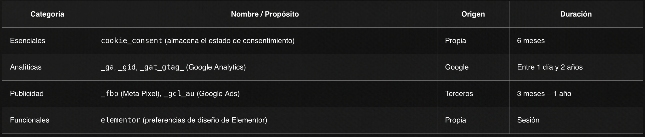 Esenciales: permiten la navegación y uso básico del sitio (autenticación, seguridad).
